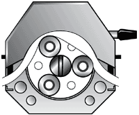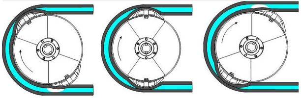 一根內壁光滑、強度可靠的特制橡膠軟管安裝在泵內部,通過一對壓輥沿著橡膠軟管旋轉擠壓,將膠管壓扁,這樣的旋轉使得介質往一個方向輸送,而不會有倒流,軟管在輸送介質之后,在被壓扁軟管的自身彈性和側導輥的強制力下,使軟管恢復原狀,此時,軟管內產生高真空將介質再次吸入管腔;然后介質在隨之而來的壓輥擠壓下從管內排出。如此周而始,介質不斷地被吸入和排出。