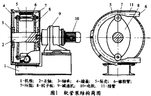 臥式軟管泵主要構成部分:機座、主軸、軸承、端蓋、泵殼、橡膠管、壓輥、轉子板、減速機、電機、接管等部件。該系列泵有單管和雙管兩種形式,可作為清池自吸泵、壓濾機泵、泥漿泵使用。